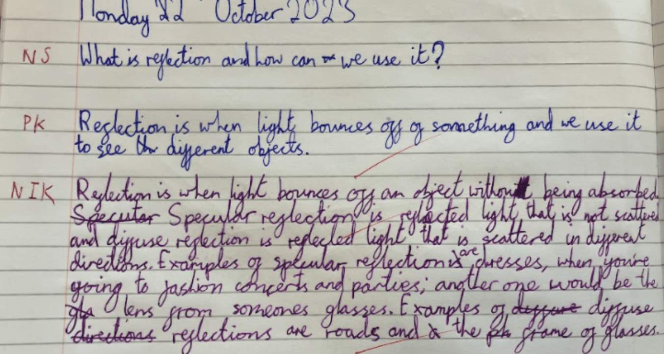 At Saracens Broadfields, every lesson is started with the big North Star Question. Children are given the opportunity so share what they know at the start of the lesson. They revisit the North Star question at the end. Using their purple pens, children show off their new substantive knowledge!